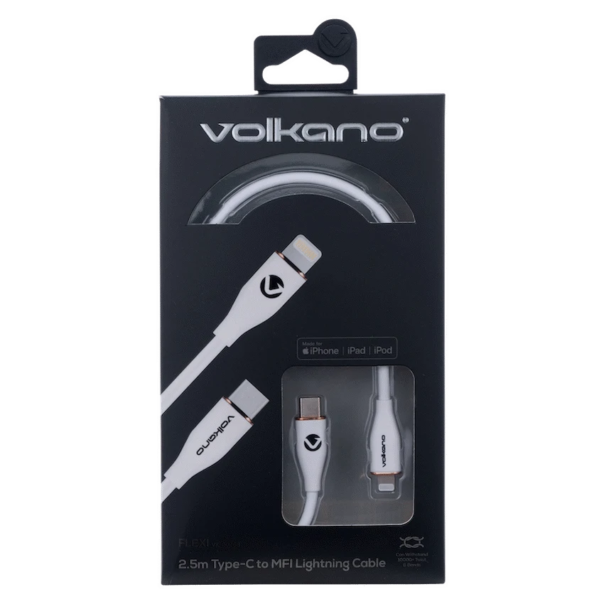 Volkano Flexi Series Type-C to MFI Lightning 2.5M 27W -White Type-C to MFI Lightning • Cable Length: 2.5m • Current: 9V 3A, 27W Round Cable • Material: High Flexibility Silicone Composite • Function: Charge and Data Transfer