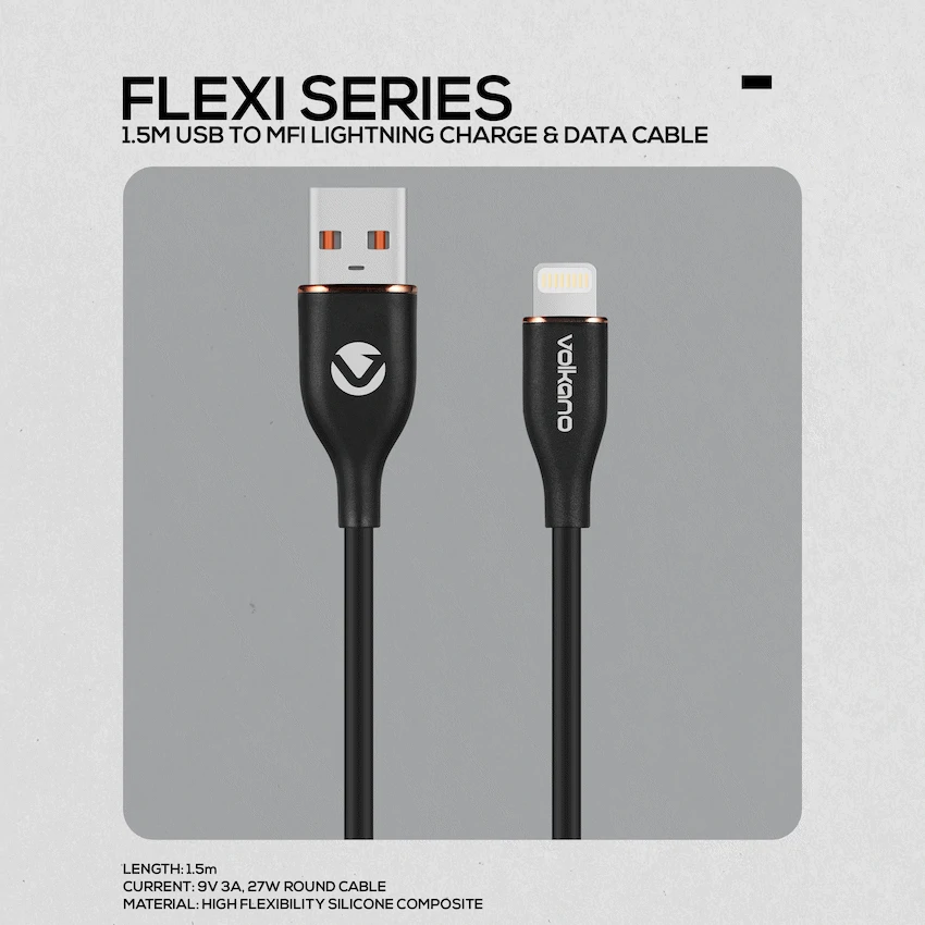 Volkano Flexi Series MFI USB to Lightning 1.5M 5V 2.4A 12W – Black USB Input Apple Certified MFI output Charge plus data transfer 1.5m length